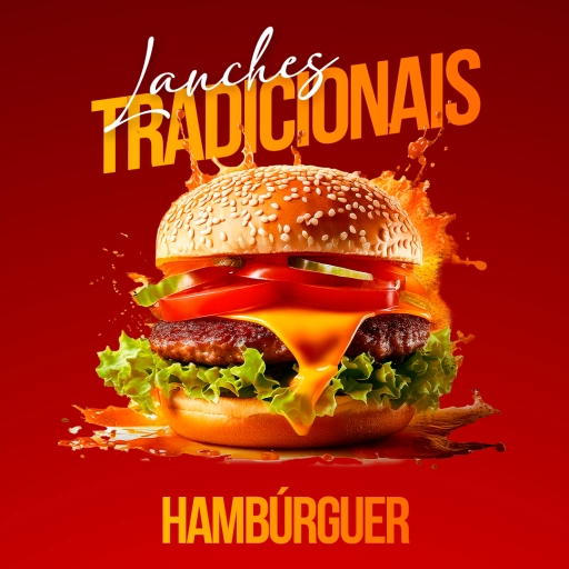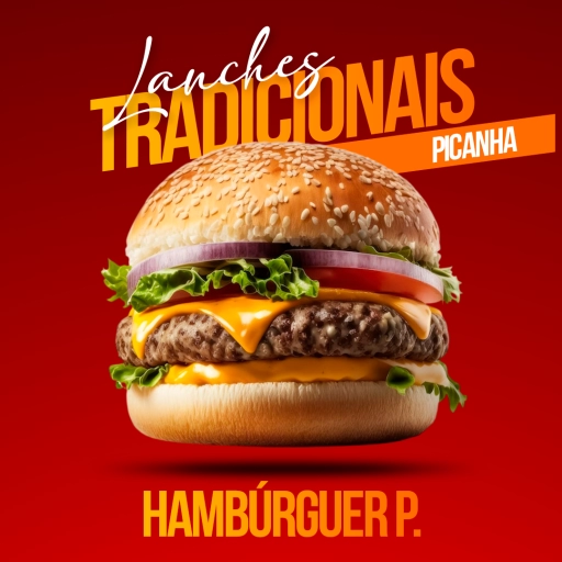 Pão, Bife de Hambúrguer, Queijo, Presunto, Alface, Tomate, Milho, Batata Palha.