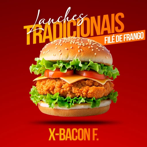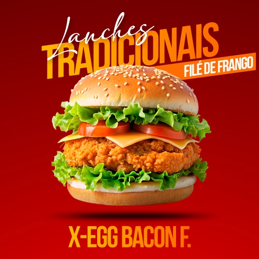 Pão, Bife de Frango, Bacon, Queijo, Ovo, Alface, Tomate, Milho, Batata Palha.