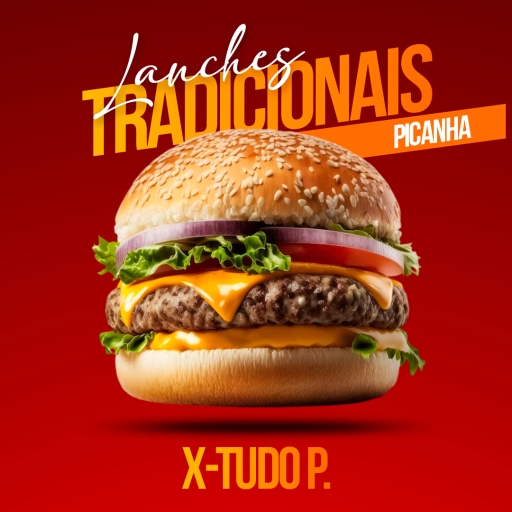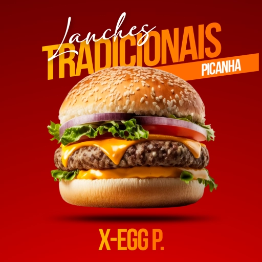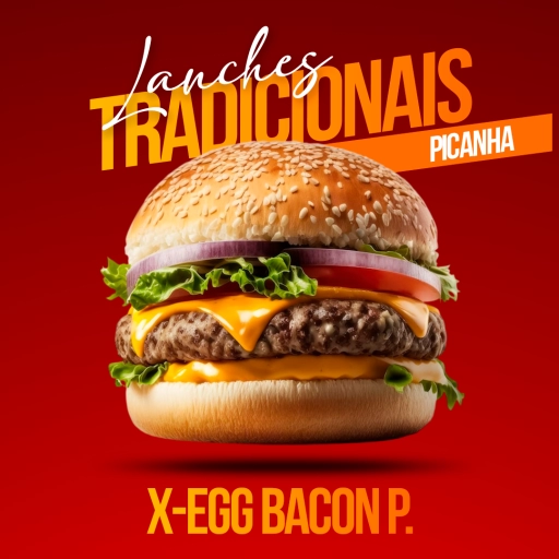 Pão, Bife de Picanha, Bacon, Queijo, Ovo, Alface, Tomate, Milho, Batata Palha.